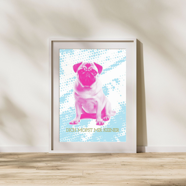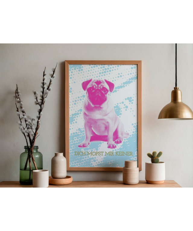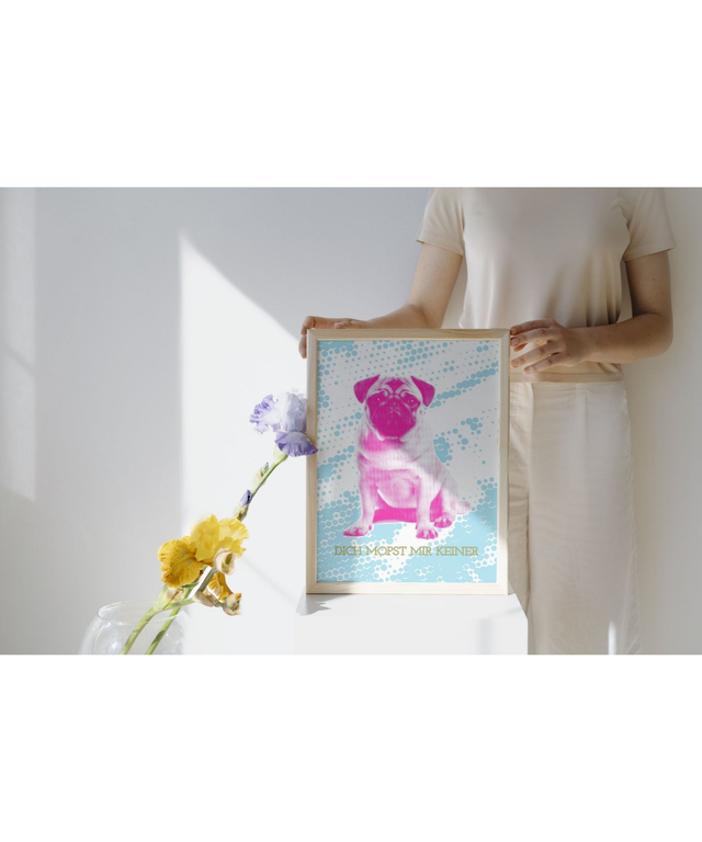 Dieses farbenfrohe Mops Poster im Pop-Art-Stil bringt Humor, Farbe und Persönlichkeit an deine Wand.